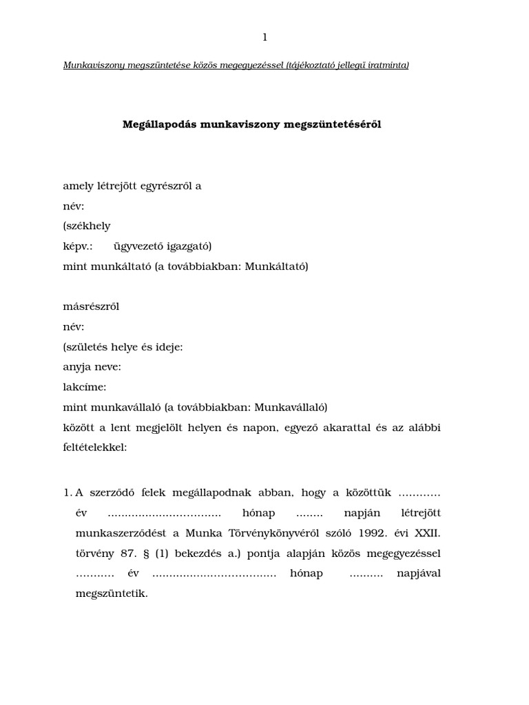 Munkaviszony Megszuntetese Kozos Megegyezessel Masolata