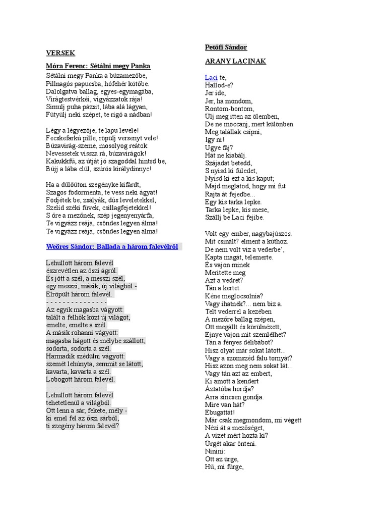 Versek Mora Ferenc Setalni Megy Panka Petofi Sandor Arany Lacinak